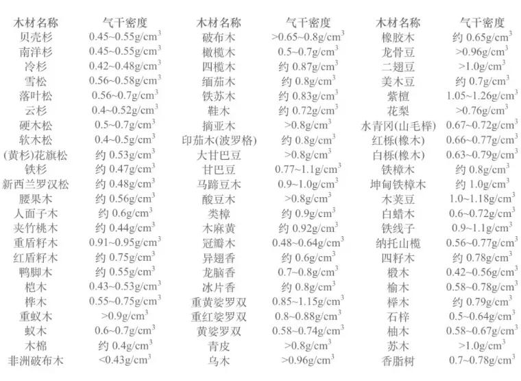 度是根據木材干燥至標準含水量得出的。同時密度也與硬度、強度和應用的難易度相關。